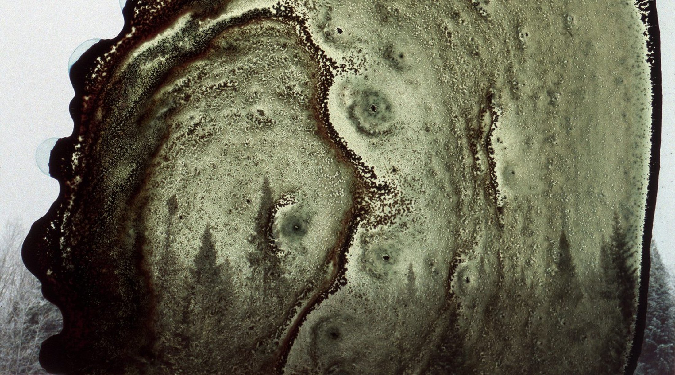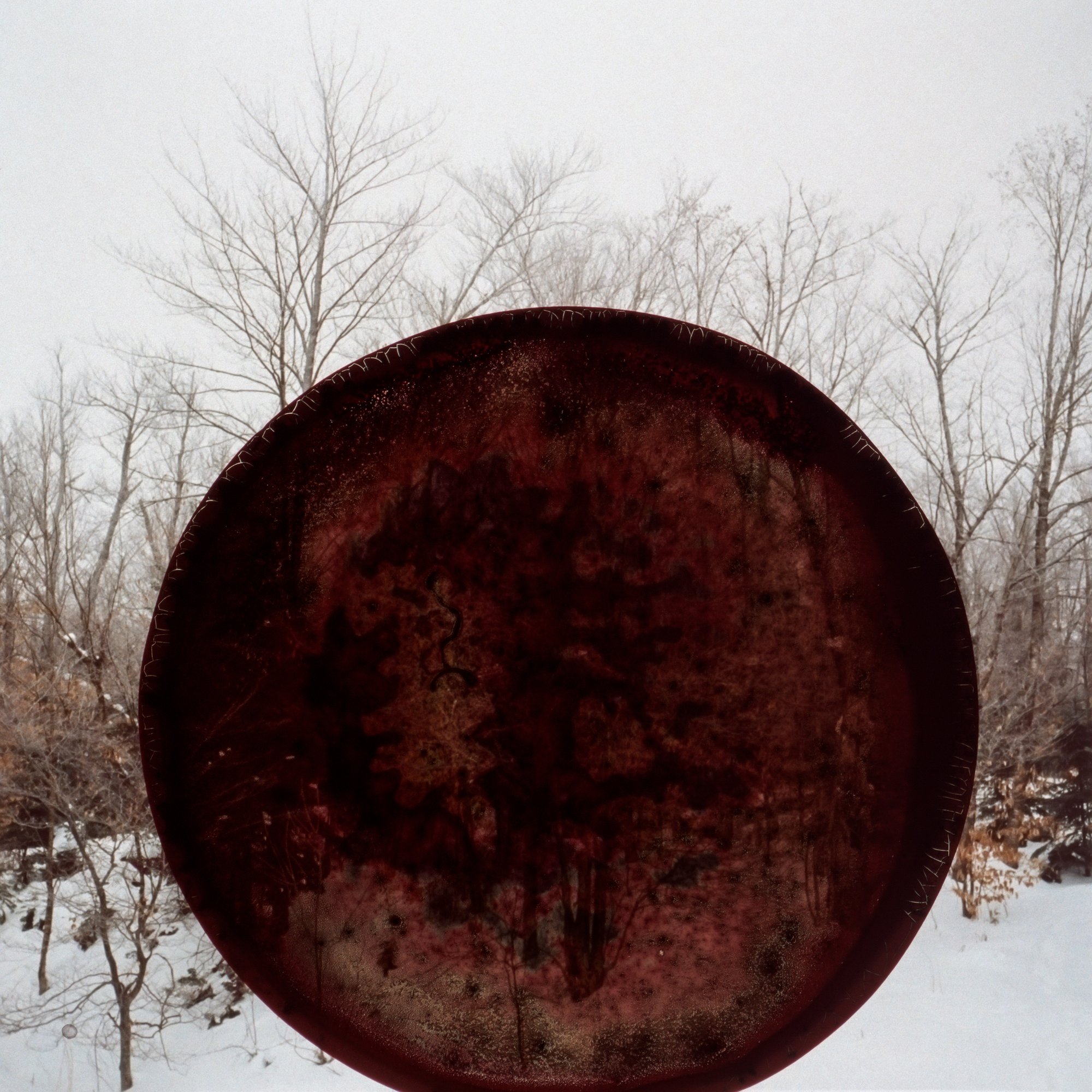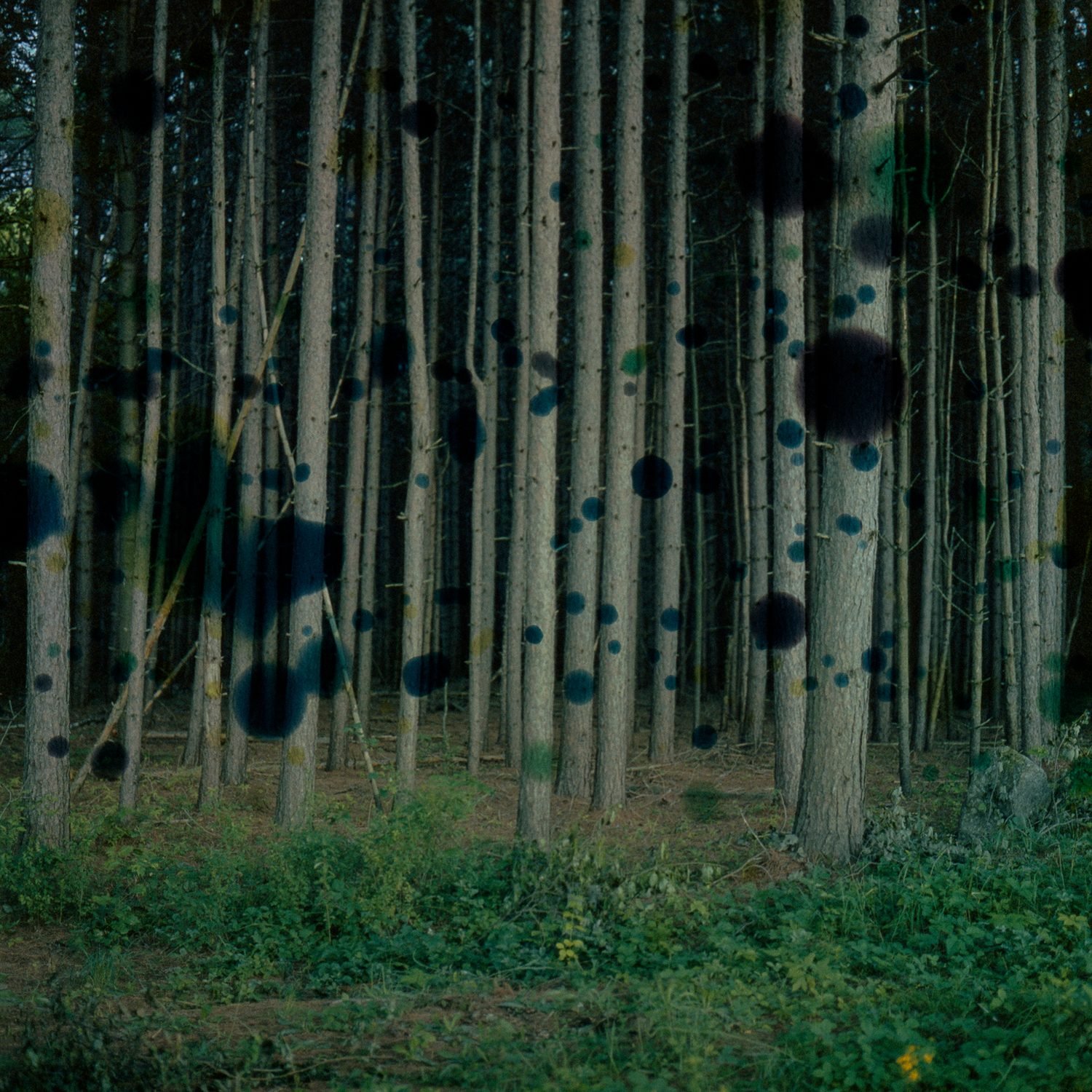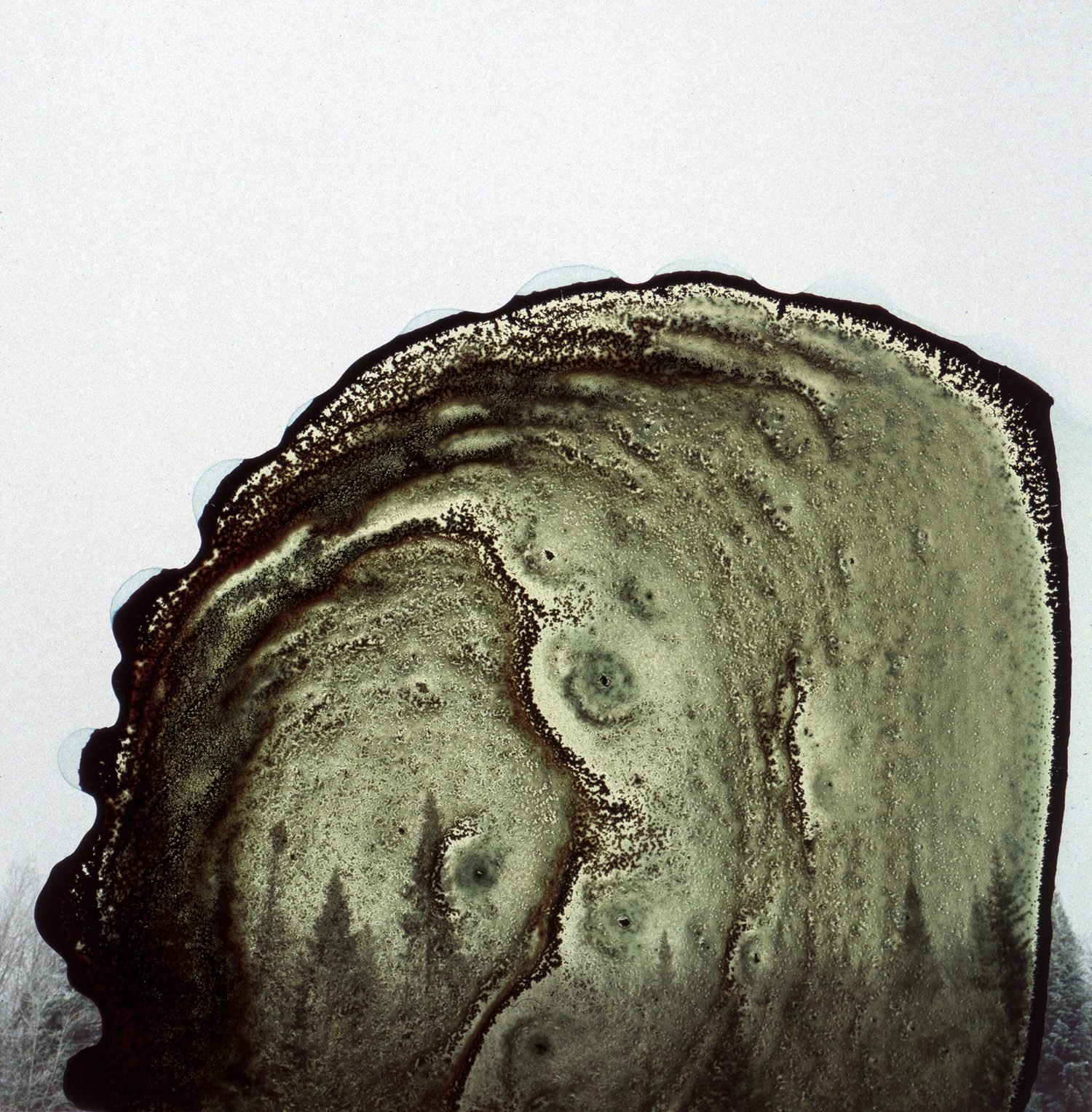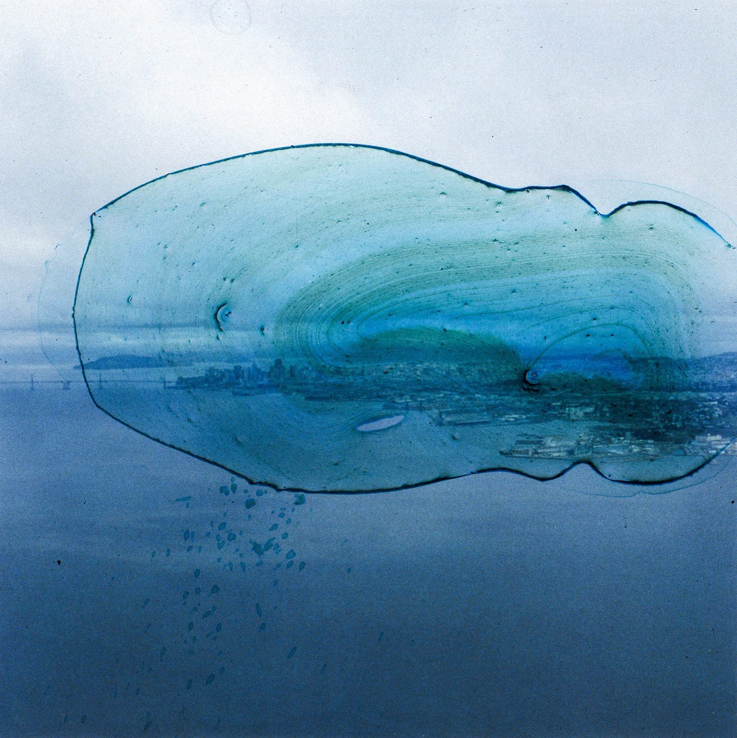For this series, I used antique photo retouching inks and old slides from my personal photo archive. These inks are traditionally used to erase flaws that occur in analog photography—to create a ‘perfect’ print. This process of dropping ink onto slides with a dropper is not unlike testing for pathogens on medical slides. The inks interact serendipitously with the landscape, as stains, blotches, floating vessels, imaginary interventions, each suggesting different relationships to the land; political, environmental, formal, and corporeal.