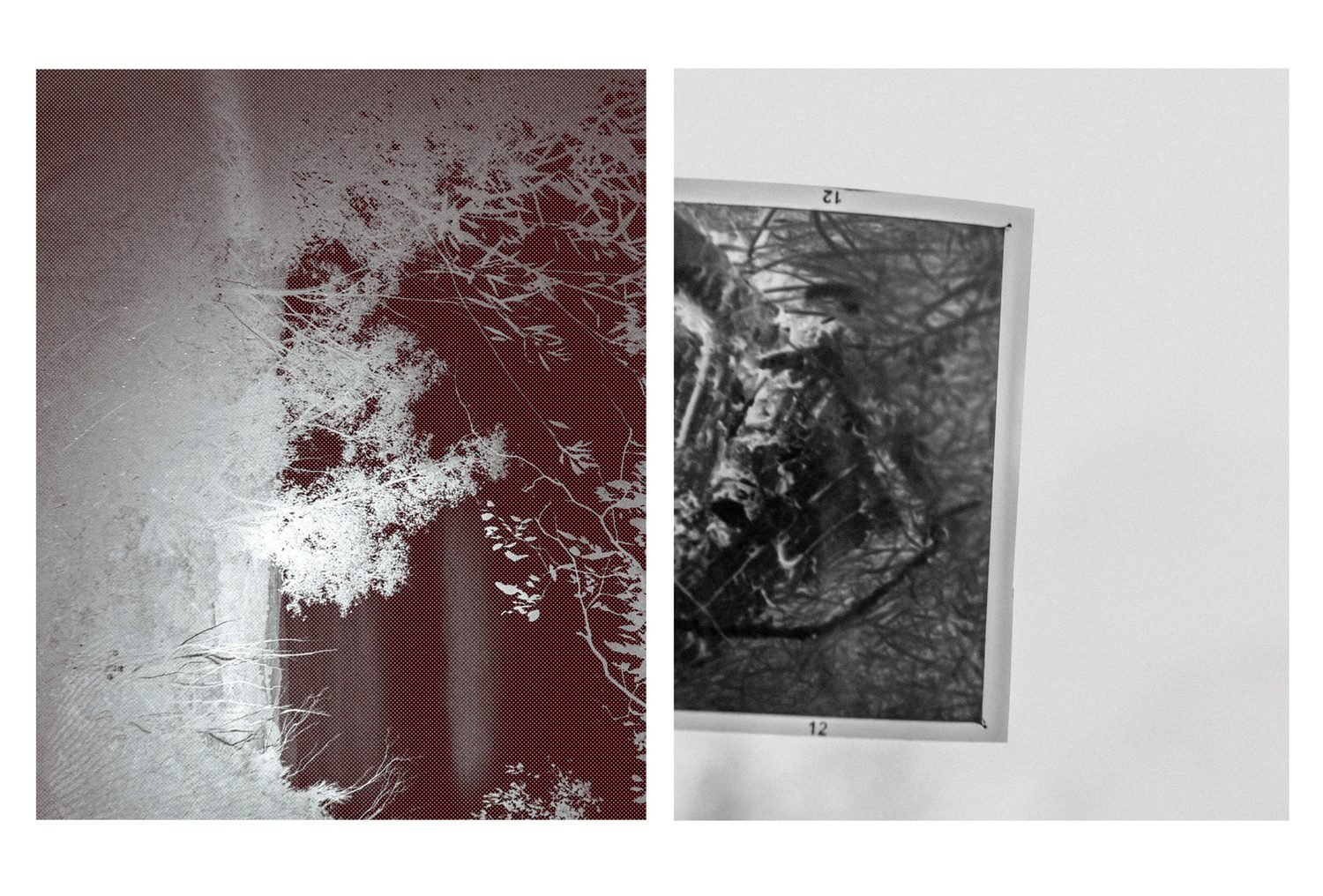 Loynd’s photographs are presented as diptychs, a format she has used in the past for how the images talk to each other. She began the work by taking photos of herself holding the negatives up to different light sources, whether it was in front of a TV, up to the sky, or against trees.