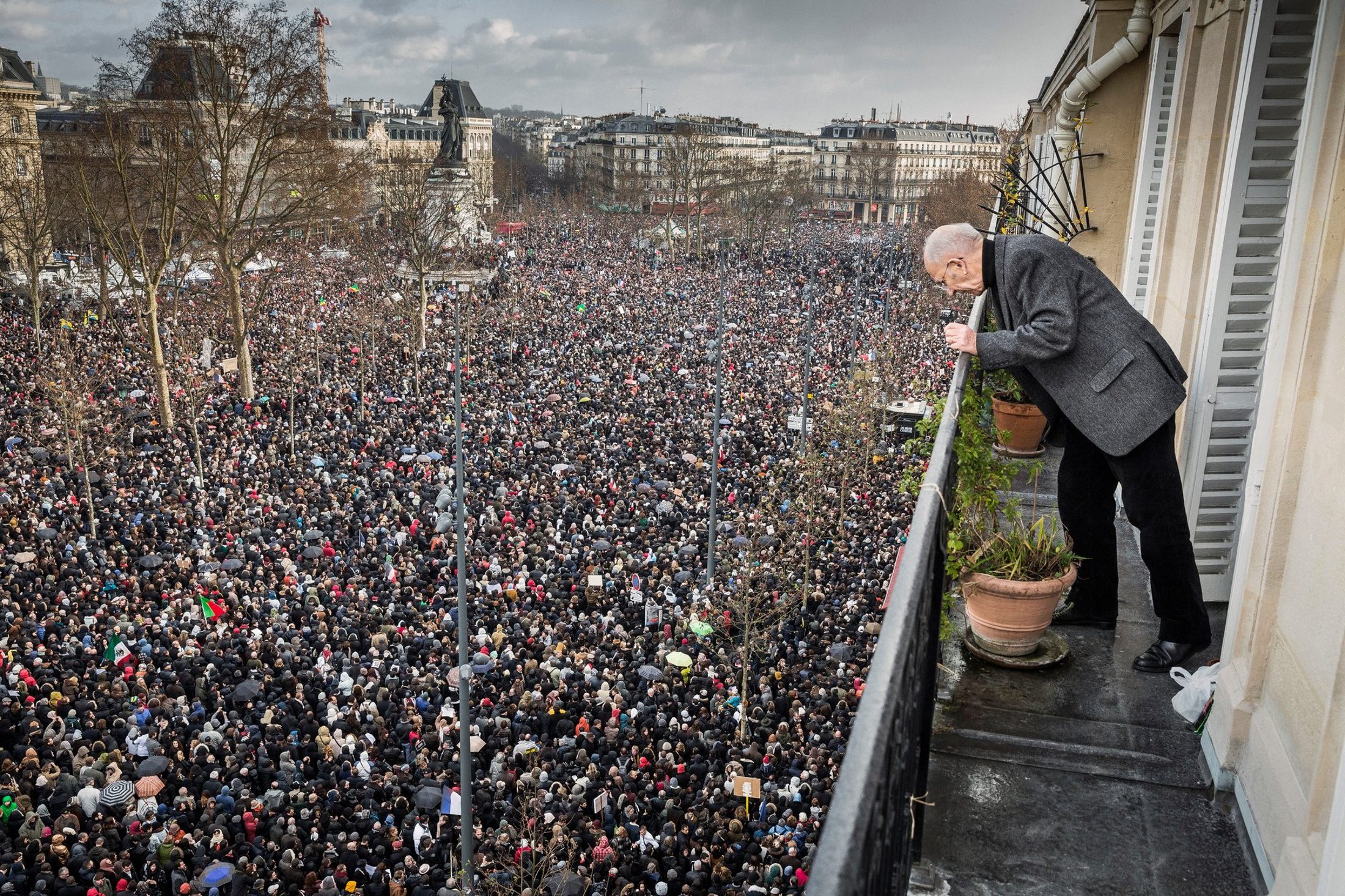 For twenty years, Jean-Pierre has enjoyed the view from his balcony at Place de la République and for twenty years he's never seen this many people gathered on the Parisian square. Between 1.5-2 million individuals were estimated to have shown up for the commemoration on January 11. © Asger Ladefoged