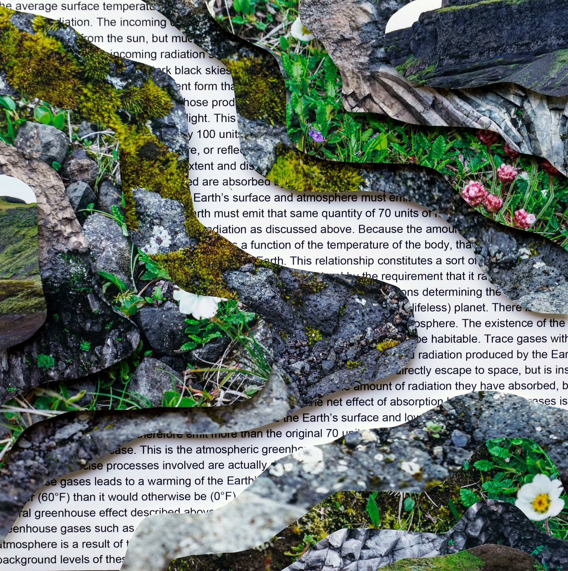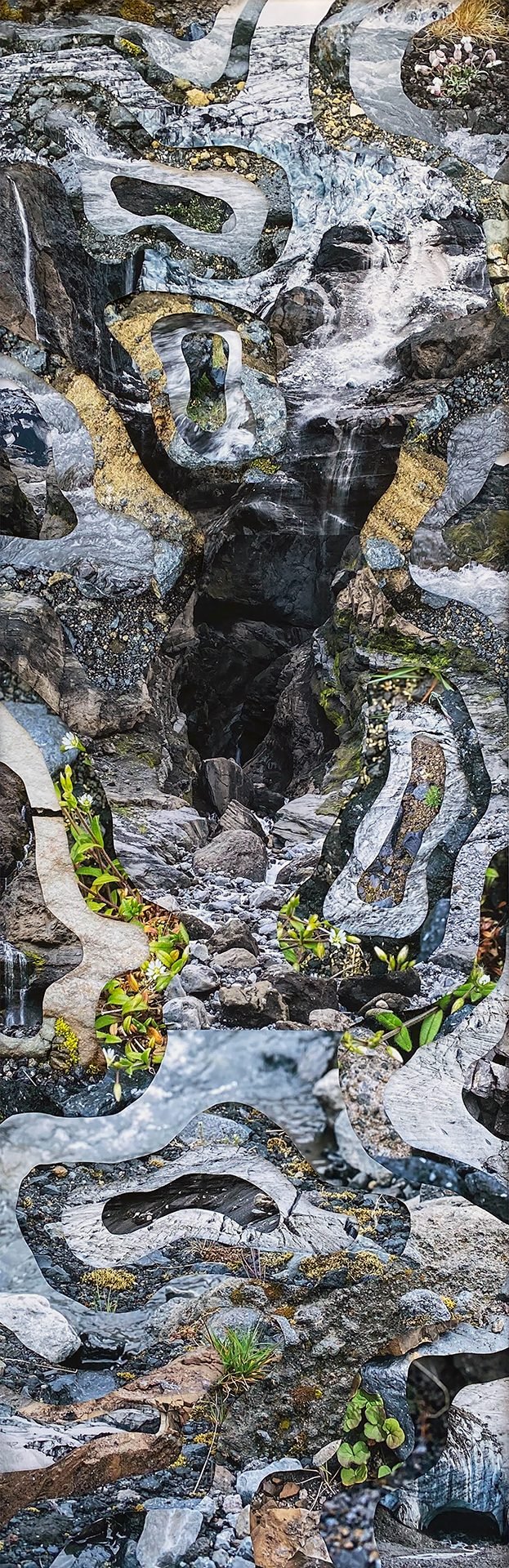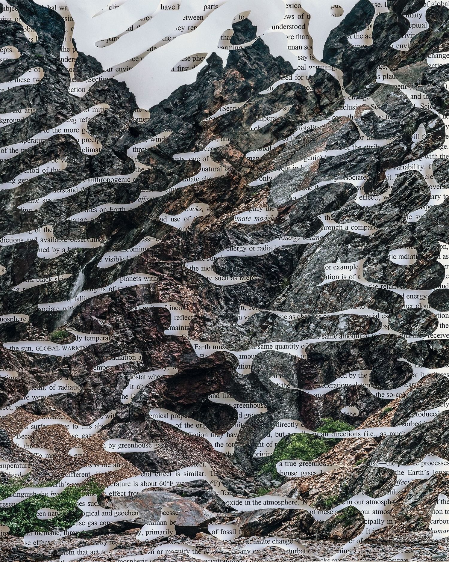 I abstracted the patterns and wanted to expand on that, so I started cutting the photographs instead of just the patterns. I began to glue them back onto other photographs and that evolved into these topographic images. I work with time in all of my projects. I like the added elements and change it brings. Through that, I realized that there was more behind it because I was effectively destroying the photographs of the landscape. I started thinking more about the environment, global warming, and the meaning underlying these gestures.