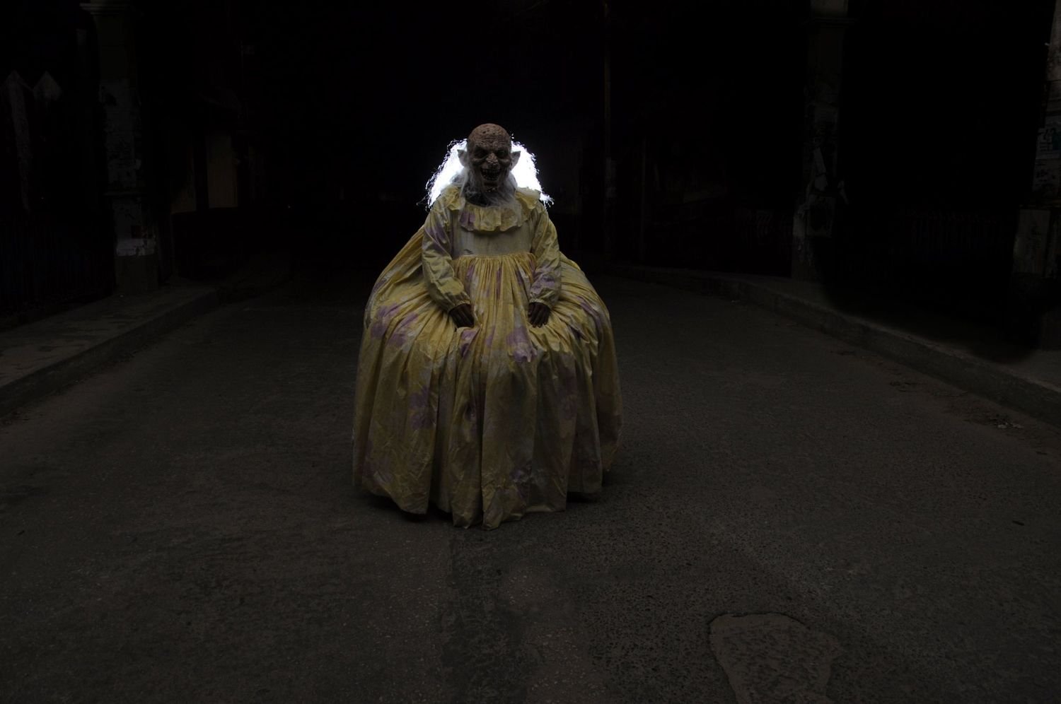 The way they look depends on the severity of their wrongdoings: the more sins they have committed, the more grotesque and elaborate their appearance is. An important collective ritual in his neighborhood, the flocks of people in fantastical costumes marching the streets with the Virgin Mary occupy a strong place in Moreno’s childhood memories.