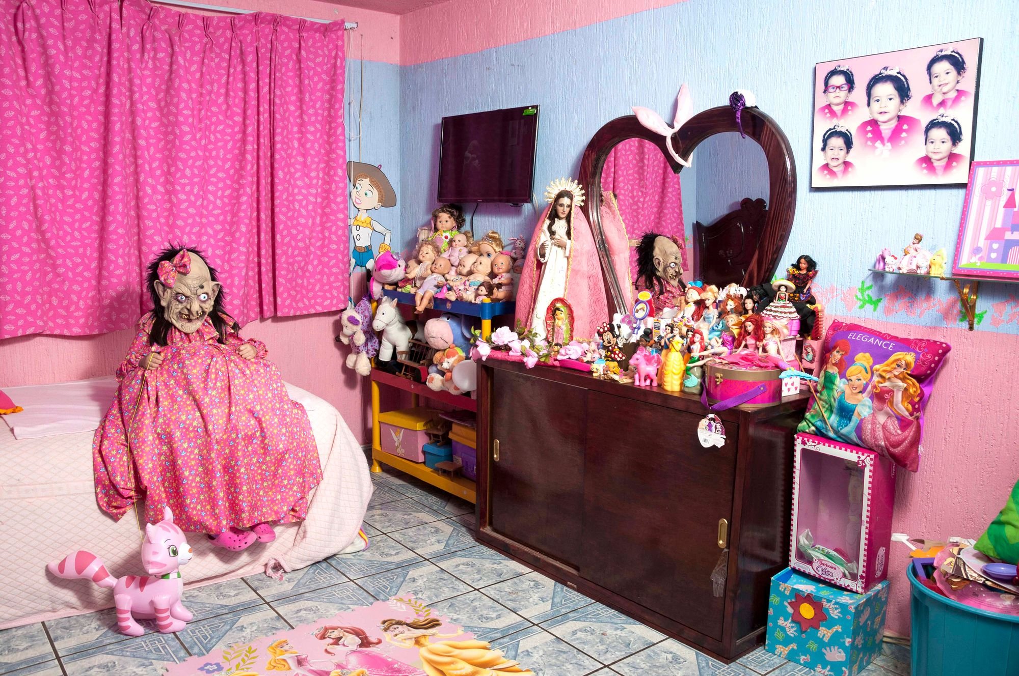 Moreno’s take on the traditional iconography takes a magical realist twist by bringing the Los Panzudos Mercedarios into the home, planting them at the heart of his family life. “I integrate this imaginary world with the exploration of family dynamics, turning it into a place full of characters that inhabit and connect with the nightmares and fears that come from my personal history,” he explains. Adorned in bright patterns and in all shapes and sizes, Moreno sees these magical figures as figments of his unconscious, transfigured into reality through photography.