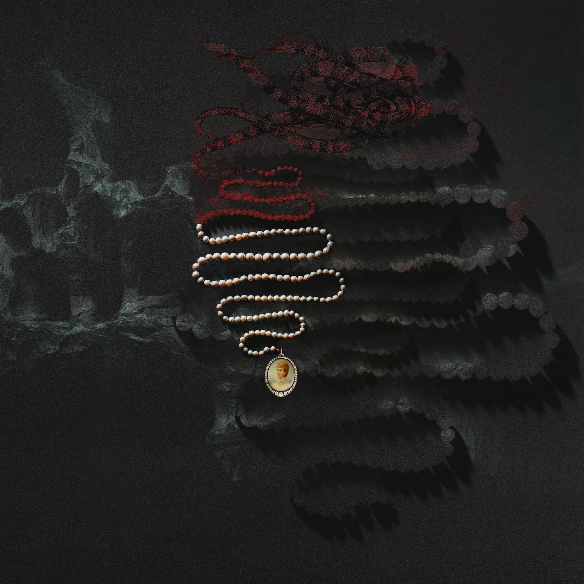 The series opens with a surrealist, turquoise-tinged image that appears like a seascape featuring mountains made out of pearls. “This image borrows its background from the outline of the coastline on Thursday island, one of the Torres Strait islands,” she explains. “The pearls come to cover the mountain line in its entirety and the curtain of the background aims to create a stage revealing some sort of suspense.” And the necklace that appears suspended above the landscape represents the pearl necklace Anna was wearing in the image she found.