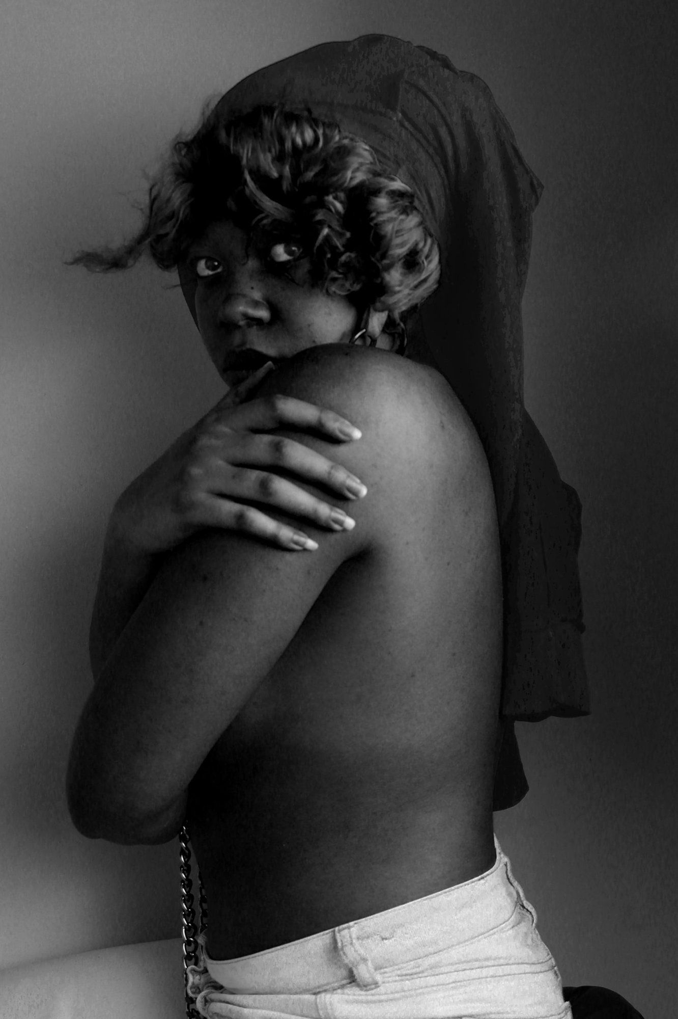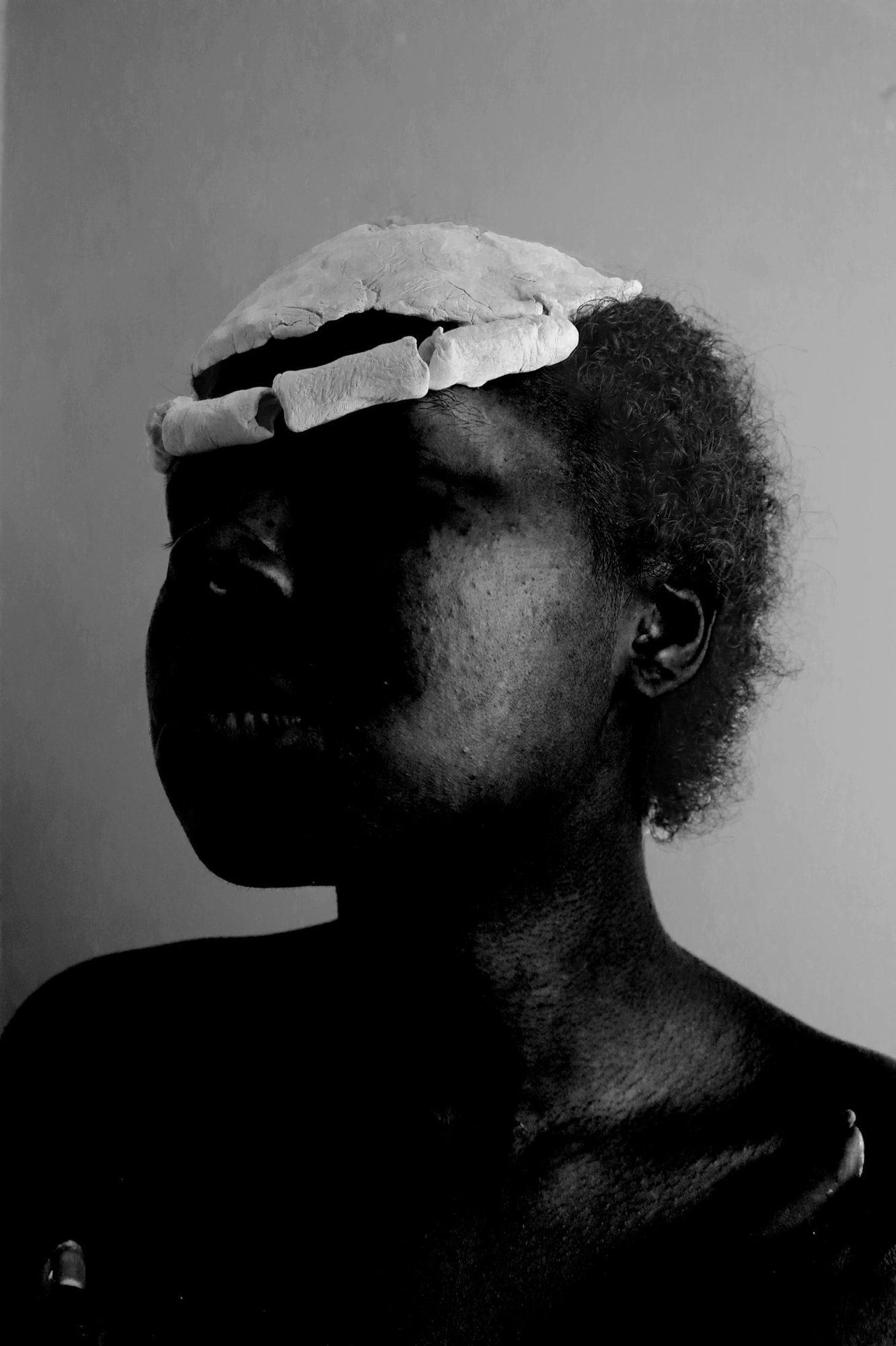 For some of the photographs, she fashioned sculptural headpieces from white clay— a choice she made because it’s a material she could manipulate easily, but also for its nostalgic connotations. “It made me feel like the child that I was returning to,” she says thoughtfully. “Often when you feel as though you don’t belong to a place, you create one for yourself. I made my own space within these images, in particular Clay Afro.” In this image, she rests her head on her hands, face tilted slightly downwards but eyes looking up, and the object appears like a sort of crown. Akinpelumi adds that the choice of film was imperative to the project. “The black and white, and the grey tones of this work are all important. I’m exploring all the different ways I see myself and all the different ways I feel perceived.” It’s like a spectrum of identity she can select from in this way.