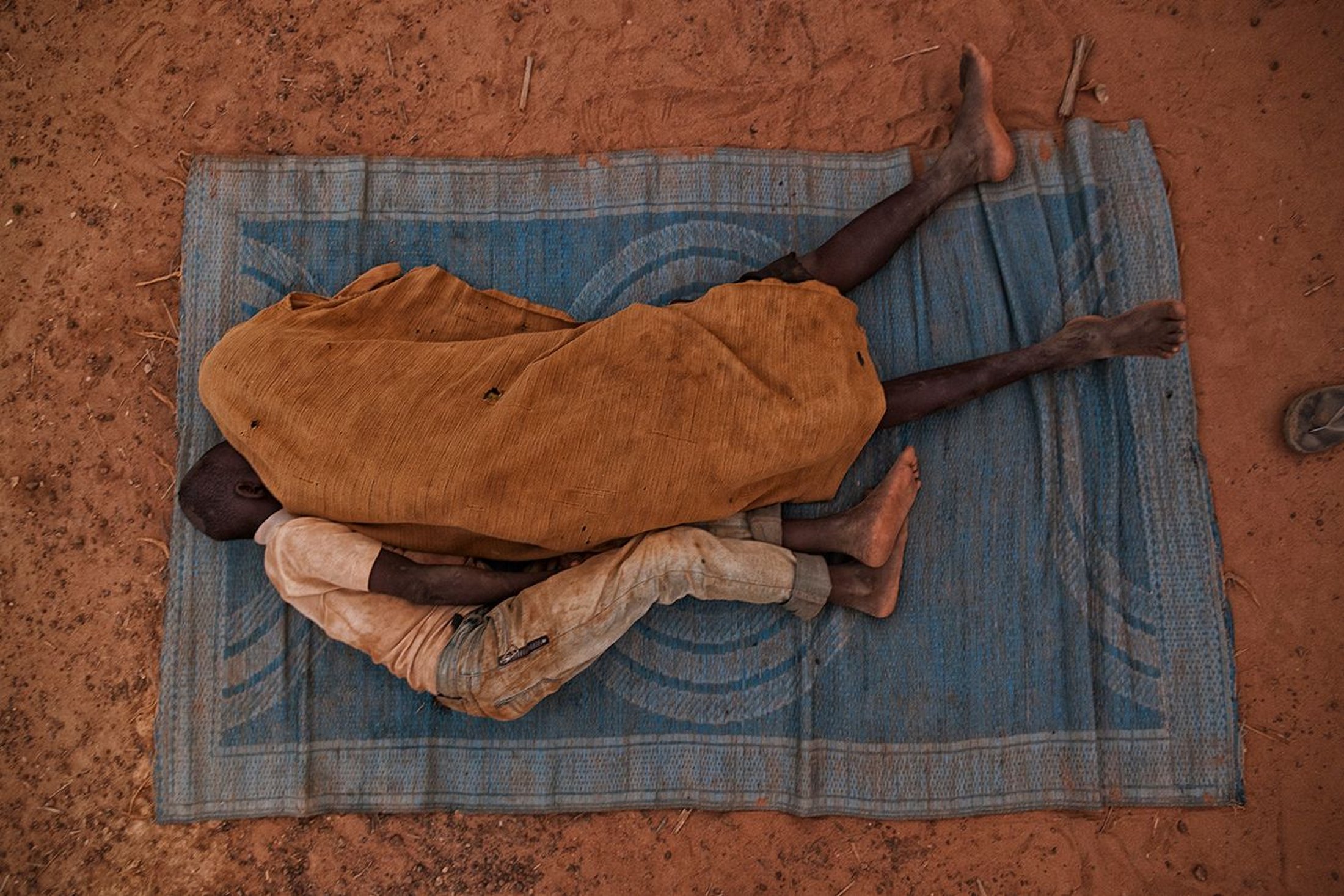 The children, who have been working since sunrise, literally sleep in the dirt beside the hole where they work. Nuru, 13, and Kongo, 15, are covered with just one blanket and sleep close to each other to keep warm during the night. © Matjaz Krivic