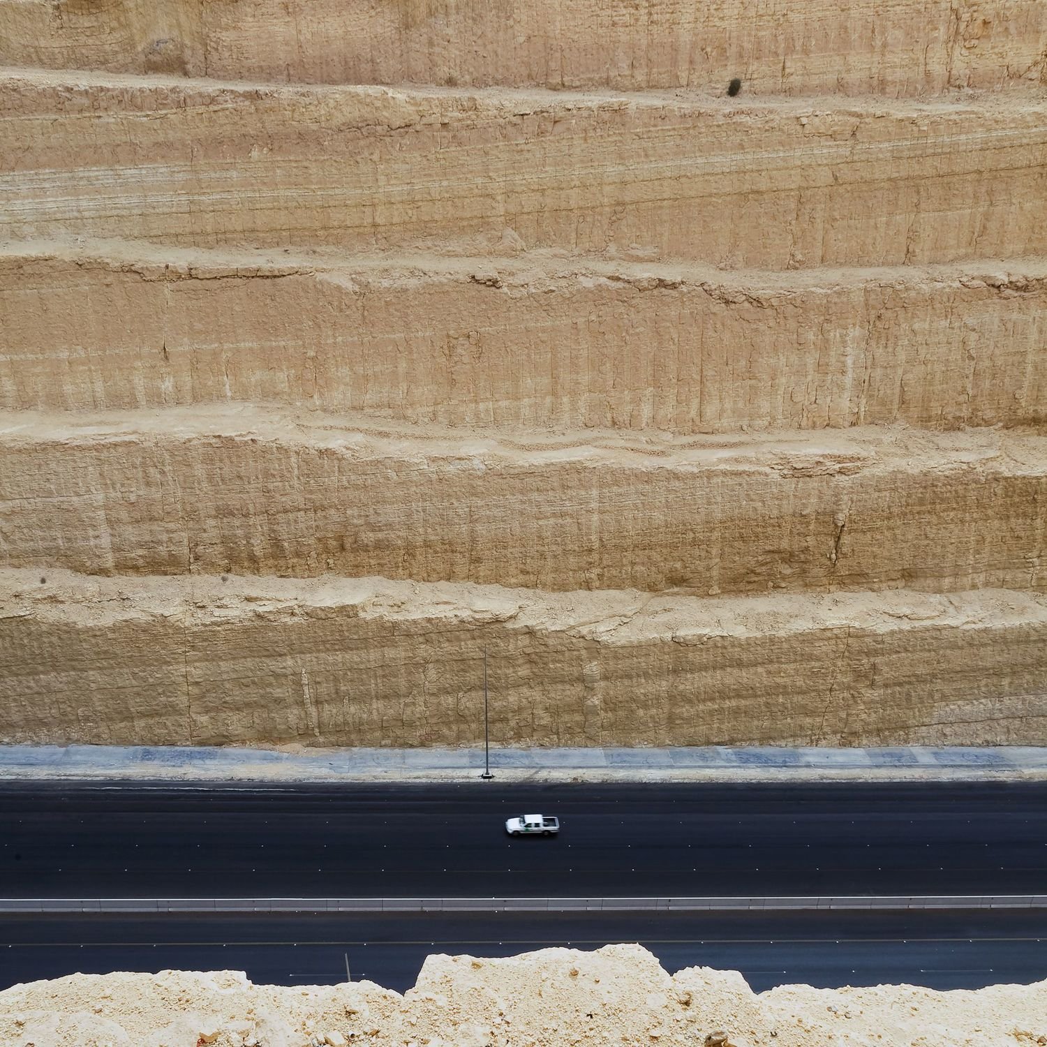 Taken together, the images in “Min Turab” (developed from 2009 until 2016) calmly scrutinize the exact places where alteration of the landscape—driven by oil as a main agent of change—has produced a fatal discord. This friction has destroyed earlier visions and ideas of place; notions that we (as uninformed foreign spectators) might have, or that locals might have as they deal with landscapes transforming rapidly before their eyes.