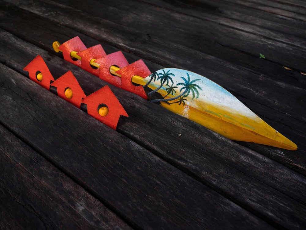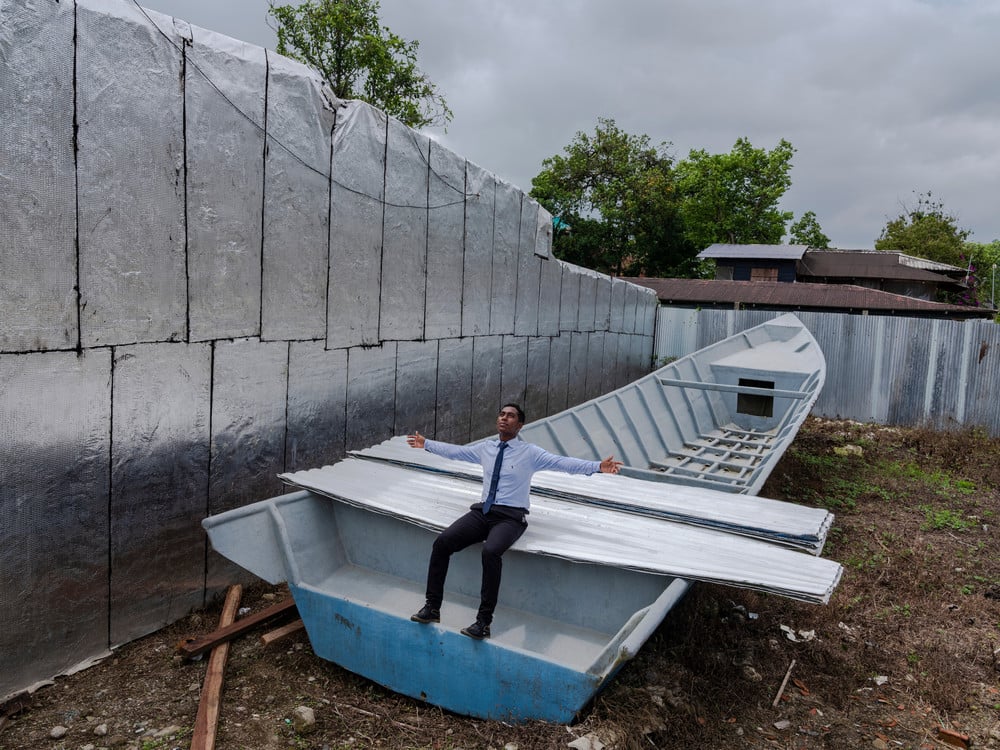 The book reflects a dialogue. Escobar-Jaramillo began to make and pair images in conversation. In one arresting combination, a young boy lies down, eyes covered with distorting glass and mouth open. On the facing page, a fish hook glistens in the sunset. In another image, a hand holds a gun, or rather that is what one might first read until a second look reveals it to be a piece of coral. Fishermen appear throughout, their faces hidden. A cinematic bolt of lightning illuminates a gathering. A wall of white-sheeted packages commands attention on an empty beach, mangroves trail into the water behind. Is this a monument or an overly ambitious haul, a sleight of hand or a dangerous find? Throughout the images, the community dazzles with their creativity, celebration, and ingenuity constructing scenes as they navigate and push back against outside pressure.
