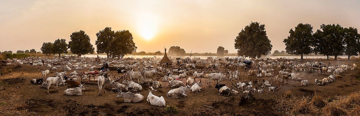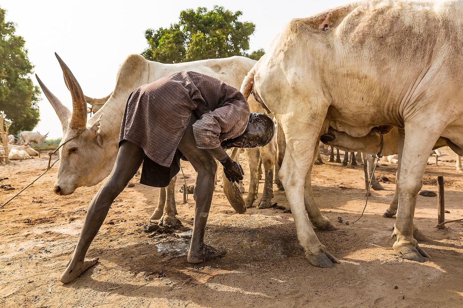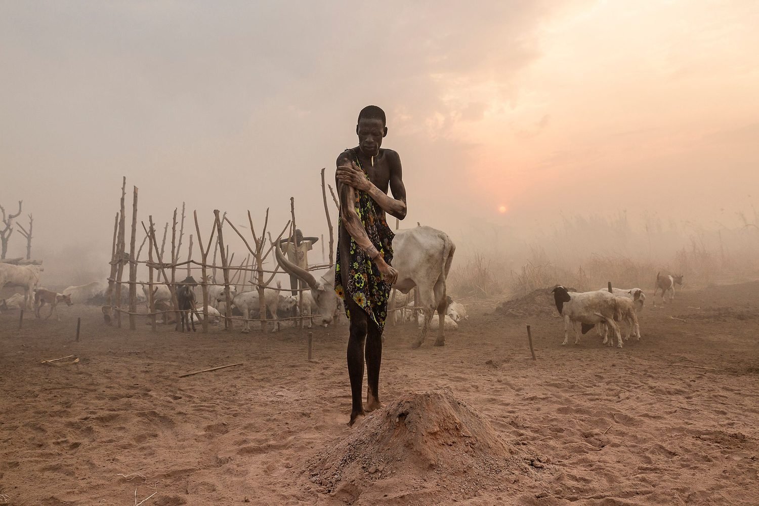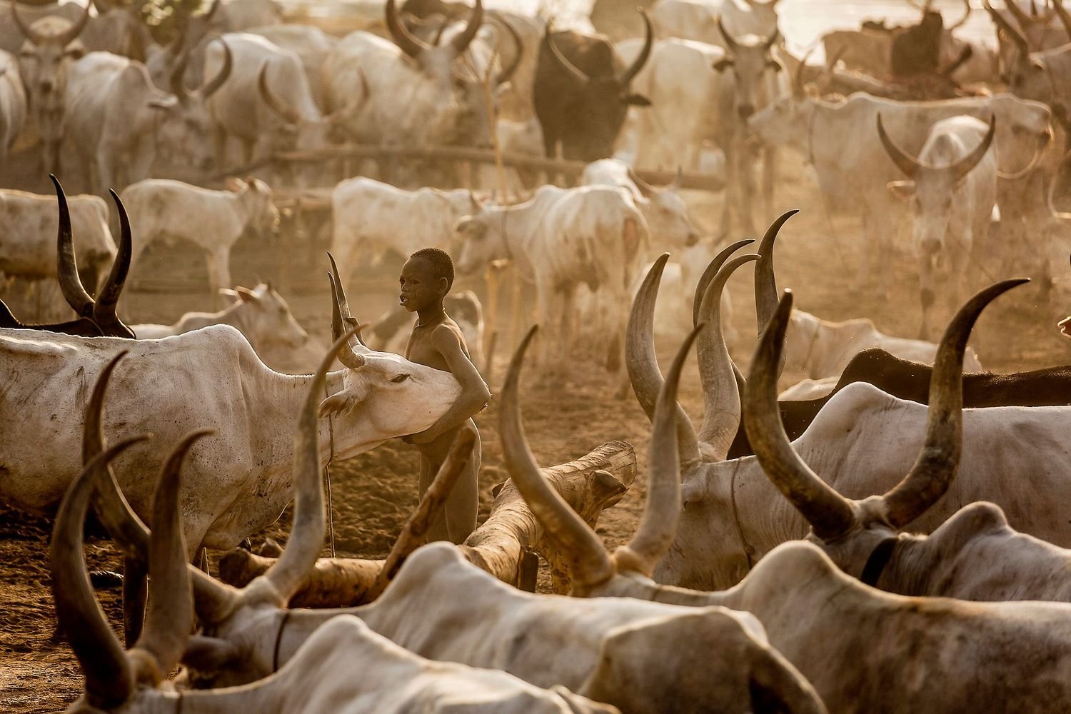 On the banks of the Nile, just north of the South Sudanese capital of Juba, dawn breaks on a Mundari cattle camp. A young man begins his morning ablutions. After cleaning his teeth with a stick, he lowers his head under a urinating cow, tethered to a post nearby. His impromptu shower will ward off infection and has the added benefit of dyeing his hair orange.