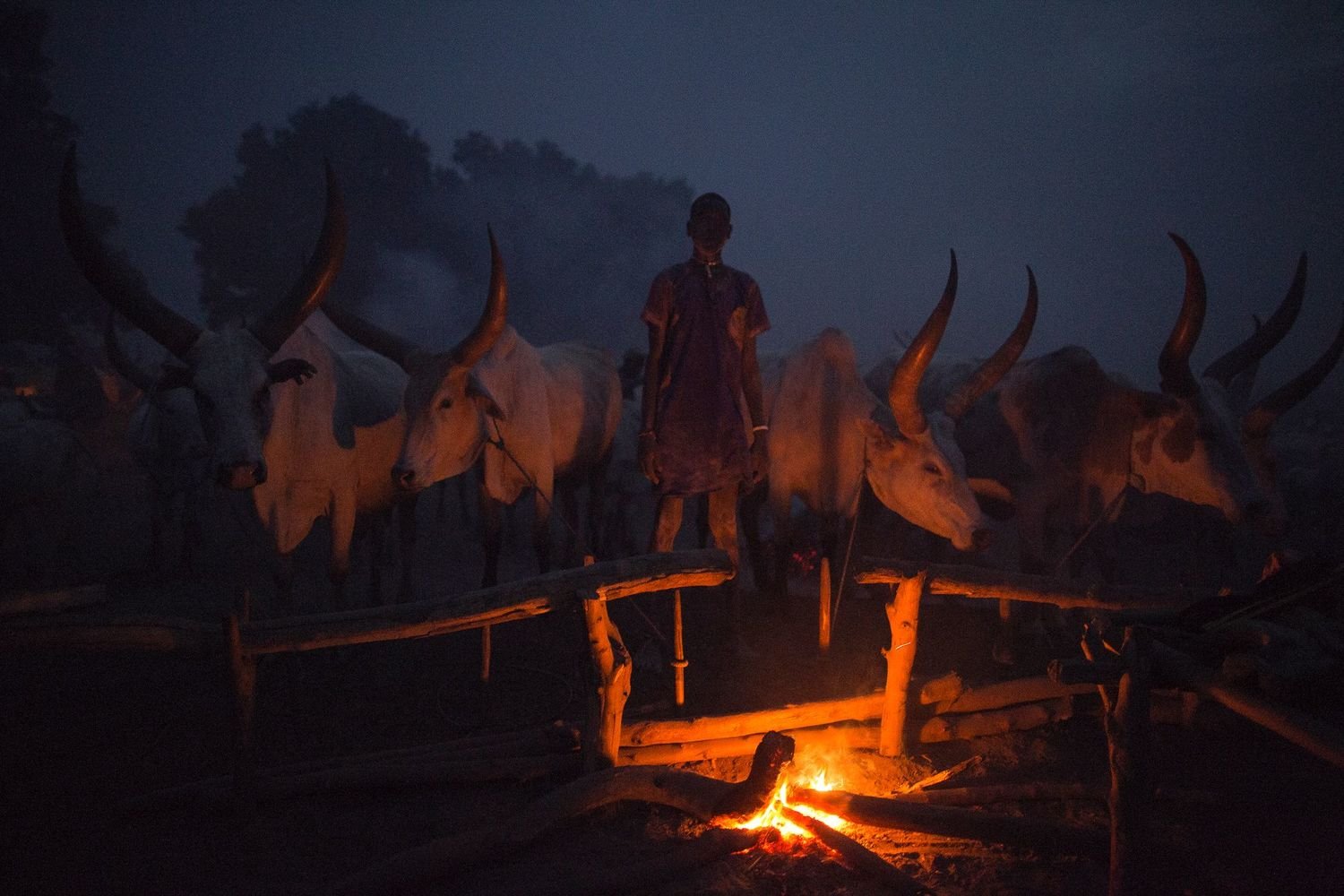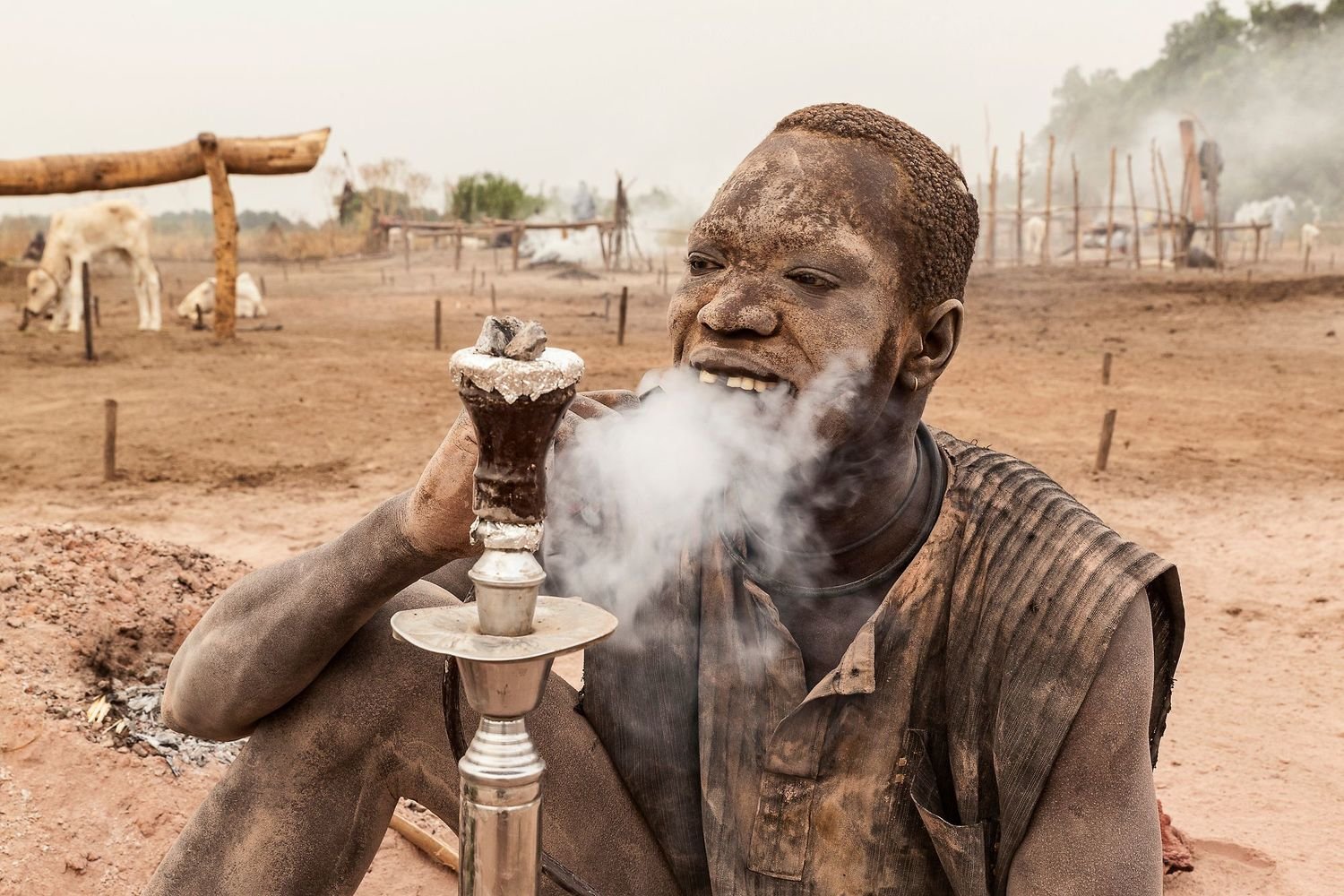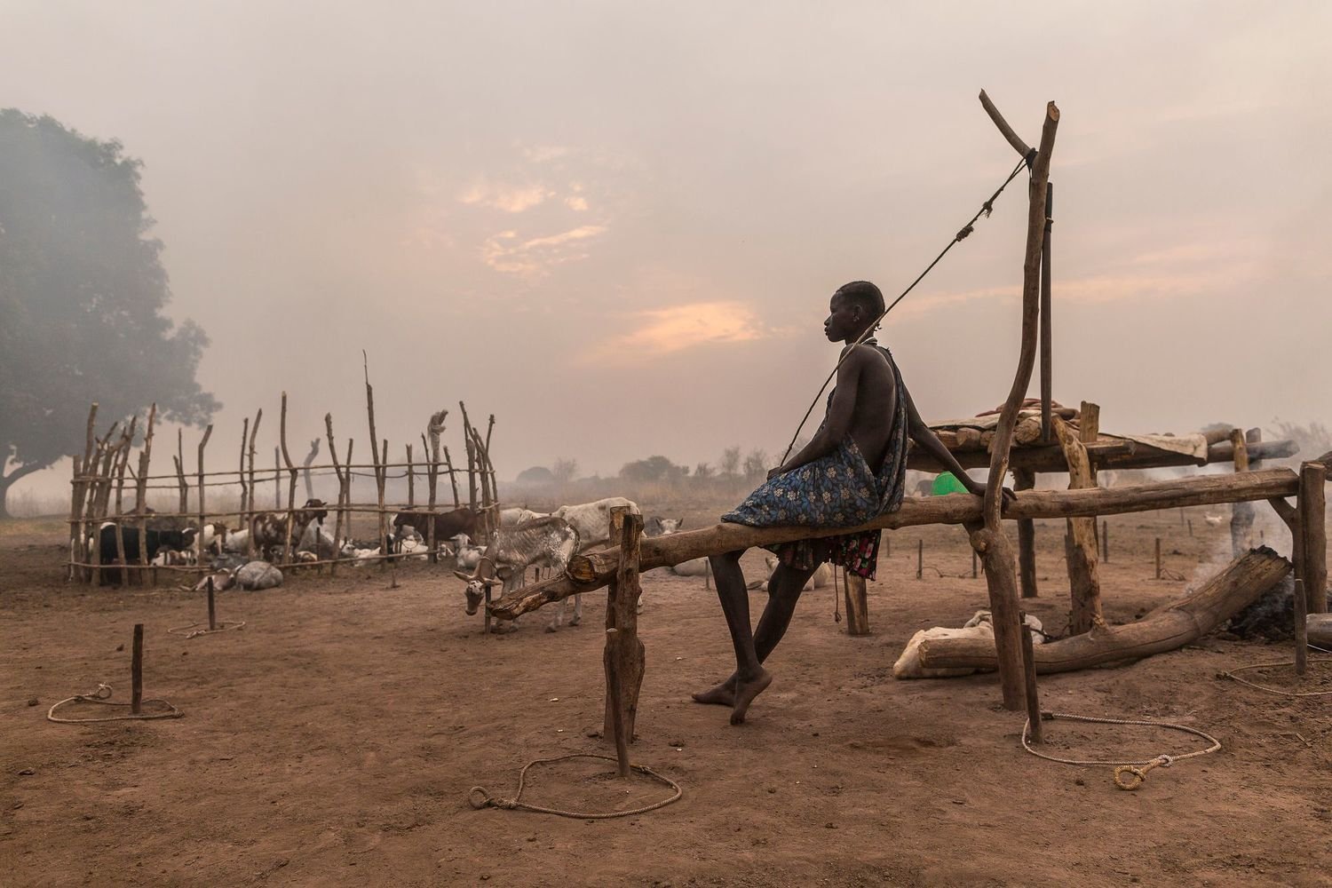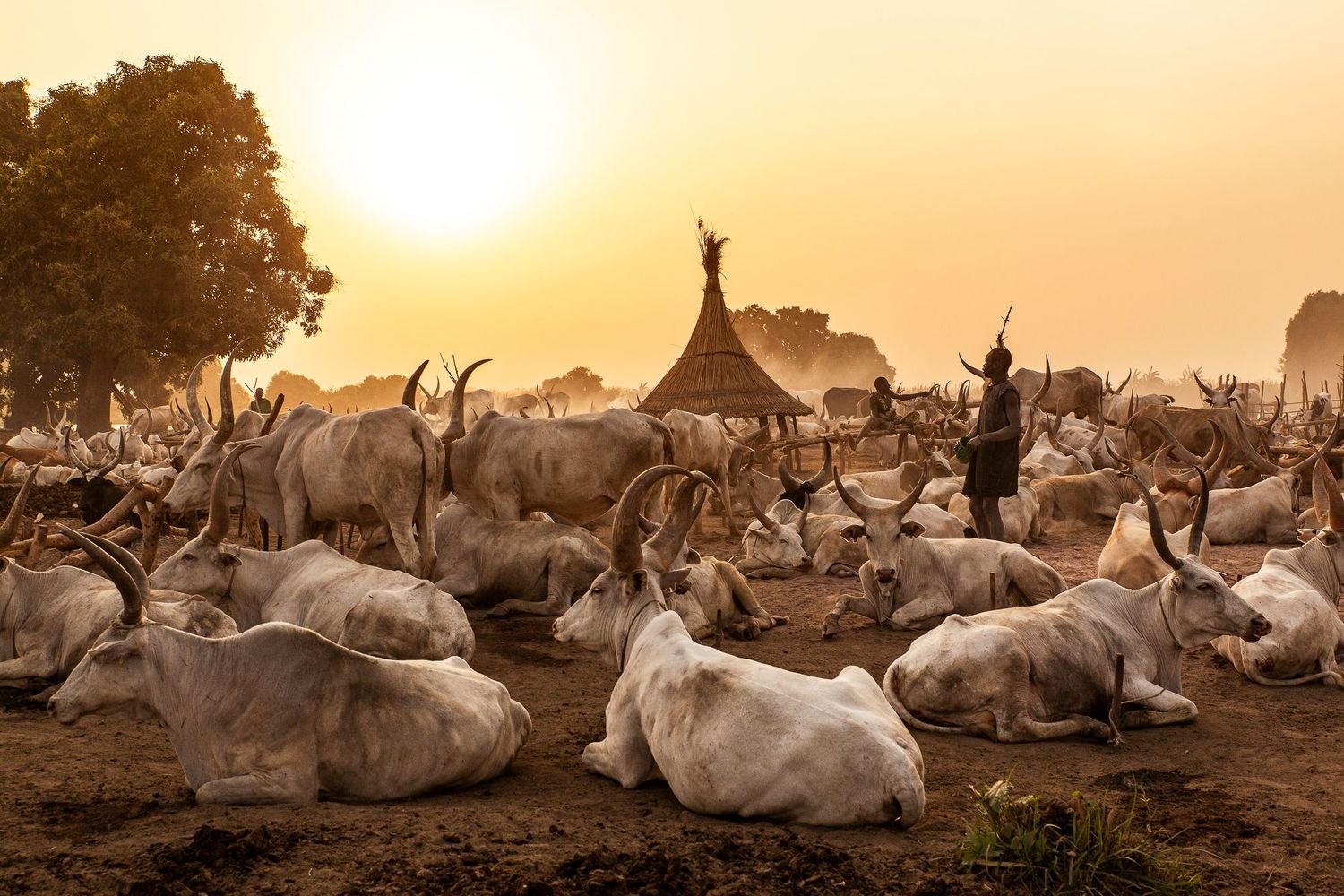 On the banks of the Nile, just north of the South Sudanese capital of Juba, dawn breaks on a Mundari cattle camp. A young man begins his morning ablutions. After cleaning his teeth with a stick, he lowers his head under a urinating cow, tethered to a post nearby. His impromptu shower will ward off infection and has the added benefit of dyeing his hair orange.