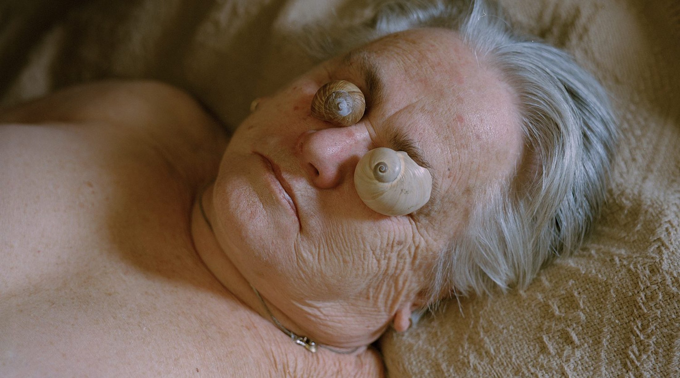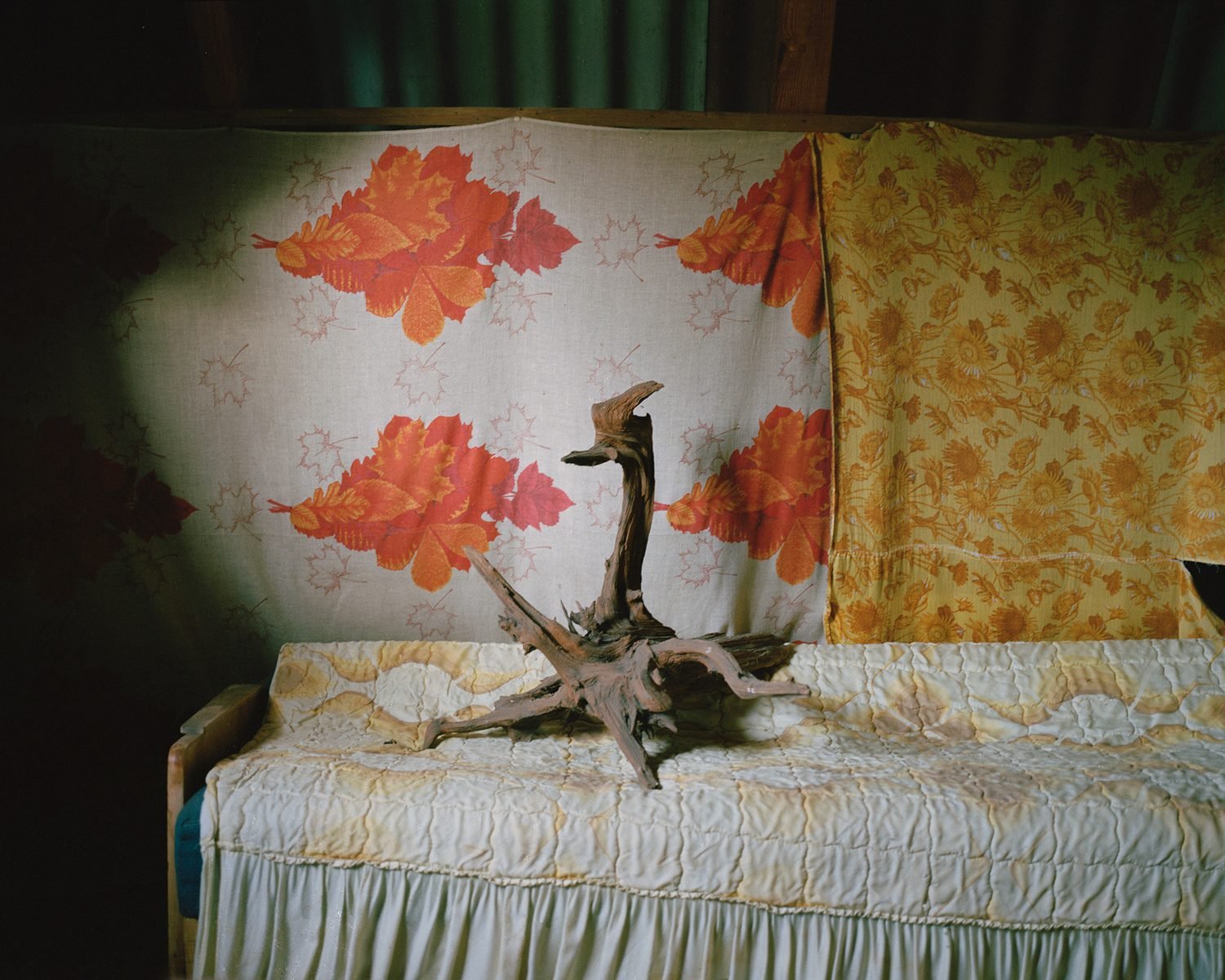 Fleshing out his grandmother’s anthropomorphic abilities further, Kawecki’s images depict natural objects like shells and branches in sentient setups. The pieces of this natural collection feel more like pets than debris, crawling across his grandmother’s body, curled up in the middle of a bed. Kawecki’s grandmother appears quiet and reverent, demonstrating her inseparability from the nature she feels at home with, its curves and contrasts reflected in the dust floating throughout each room, illuminated by the natural light pouring through aged windows.