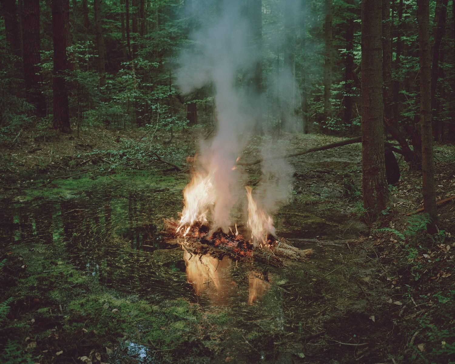 When he returned to the house to isolate, he started helping her clear the swathe of dust-covered companions—particularly dried flowers—out of the space. Kawecki and his girlfriend decided to make a straw man out of the dehydrated foliage, akin to a German strohbär, a character whose iterations can be traced throughout European folklore, often marking a shift in seasons. They took their straw man to a pond and burned it, Kawecki documenting their intuitive ritual through the lens of his camera. “We wanted to honor the time that had passed and the efforts of my grandmother in this place,” he explains. “It was our way of creating a dialogue with the land—a way of giving it some order.”