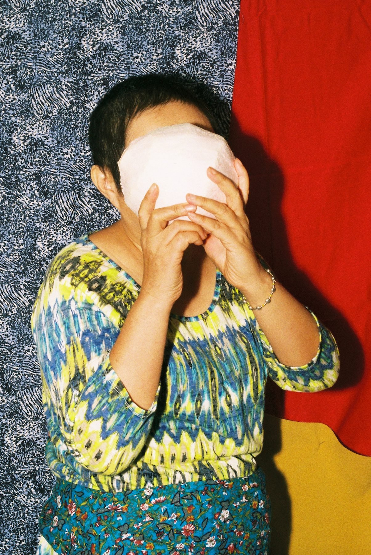 Wei’s mother is seen turned away from the camera, her eyes blocked by props held out in front of her face or pulled down low over her head. A gesture that could come across as shyness—as a retreat from the camera—reads as anything but that. She is defiant, she is herself. As Wei states, her mother was in a sense “freed from the female dilemma, she covered her face during the shooting and naturally released herself.” In coming to reconcile with her mother, she found a “rebellious and unruly female soul”.