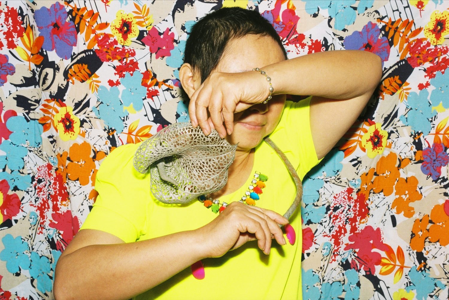 A figure, face covered, half turned away, reaches out to a floral background. Eyes, at first barely discernible, and then hard to escape, peer out from behind a silken flower. Image after image, layer upon layer, color and pattern run riot in Wei Xianwen’s series Mothers. There is an exuberance to these photographs but also something that at first feels unsettling. Who is this figure hiding their face? What are these patterns and materials?