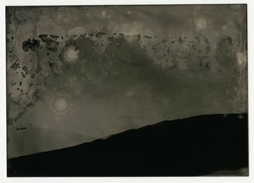 Her process begins with daily walks in the nearby redwood forest overlooking the San Francisco Bay, where she observes and connects with the landscape. She distills the gleaned information into sketches which she then translates into tintype photograms (single panels, diptychs, and polyptychs) created by placing paper cutouts on sensitized collodion film and making an exposure in darkroom conditions. She invites process artifacts manually and photochemically by employing brushes, spray bottles, cliché verre, and by manipulating chemical composition of the materials and processing duration. This is the performative aspect of image-making where chance comes into play. The artifacts add texture and depth, creating moods and atmospheres that place the work in conversation with painting and graphic arts.